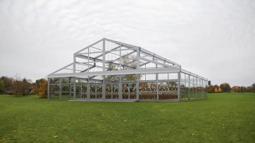 With its signature sloped roofline and transparent panels, the structure is designed to bring the outdoors in while maintaining a refined, controlled environment. Natural light fills the space during the day, while evenings transform under layered lighting and chandeliers, creating a warm, ambient glow.