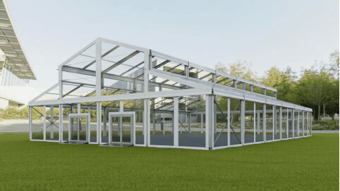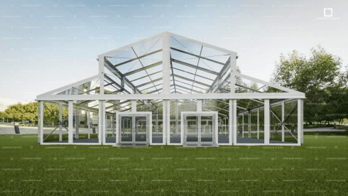 Its clearspan structure eliminates interior poles, allowing for completely open and flexible layouts. This creates uninterrupted sightlines and gives planners and designers the freedom to fully customize the space. The clean, powder coated white aluminum frame adds a modern and refined finish, while the modular design allows the structure to scale based on the needs of each event.